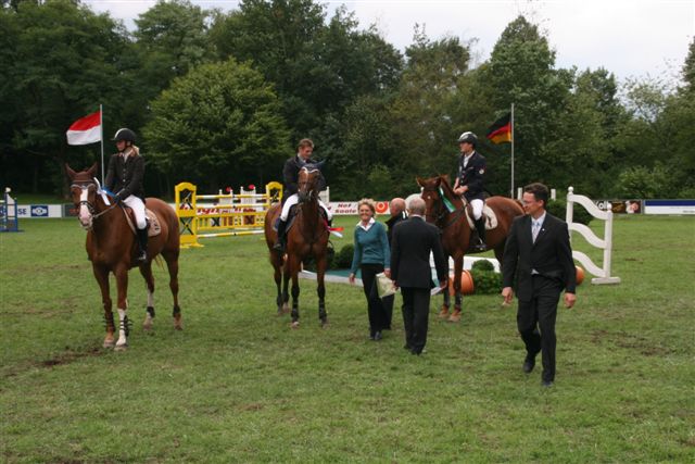 der Frankenmetropole bieten. Sonntag - Der Höhepunkt an diesem Turnierwochenende war die Springprüfung der Klasse S** mit Siegerrunde, in der sich 16 Paare in die Starterliste eintrugen. In einem spannenden Stechen, das nicht nur die Reitereltern, sondern auch die Zuschauer begeisterte, konnte der aus Hannover stammende Gerald Nothdurft im Sattel von Lord Helmchen Goedeking Tim Rieskamp mit Dorus und Verena Karle mit Calimero auf die Plätze zwei und drei verweisen. Mit diesem Sieg hat Gerald die Bedingungen für sein "Goldenes Reitabzeichen" erfüllt. 4ter Gerald Nothdurft mit Luciano, 5ter Maximilian Ziegler mit Proletto und 6ter Michael Eichler mit Conamiro. Text Quelle: Waldner-Webmedia |